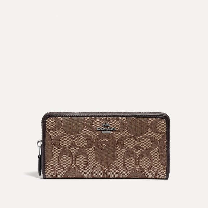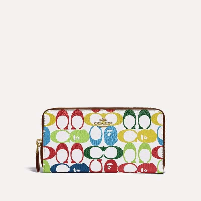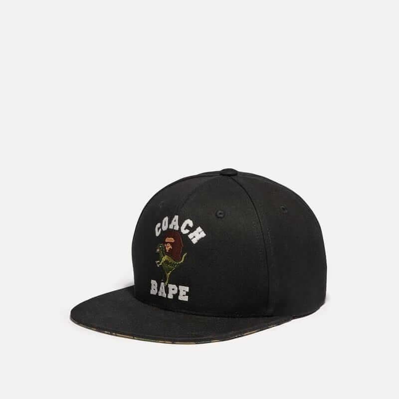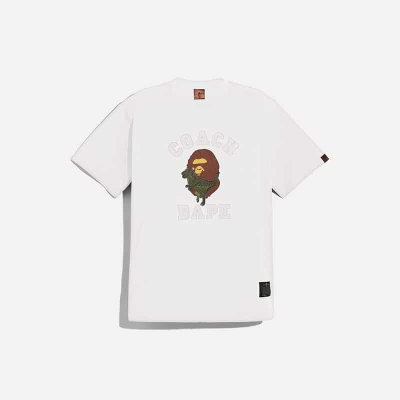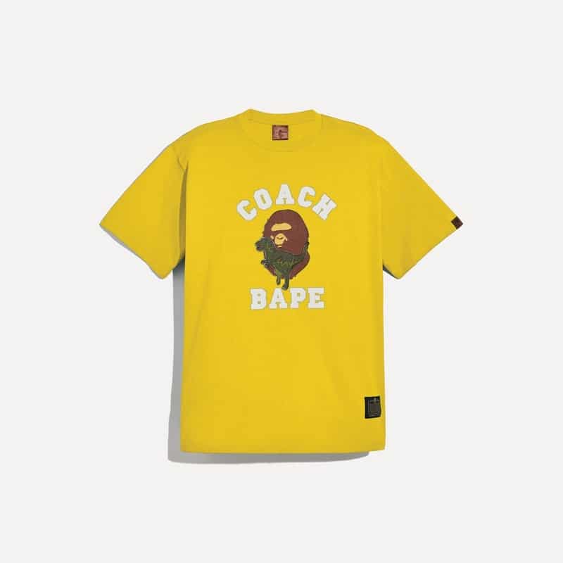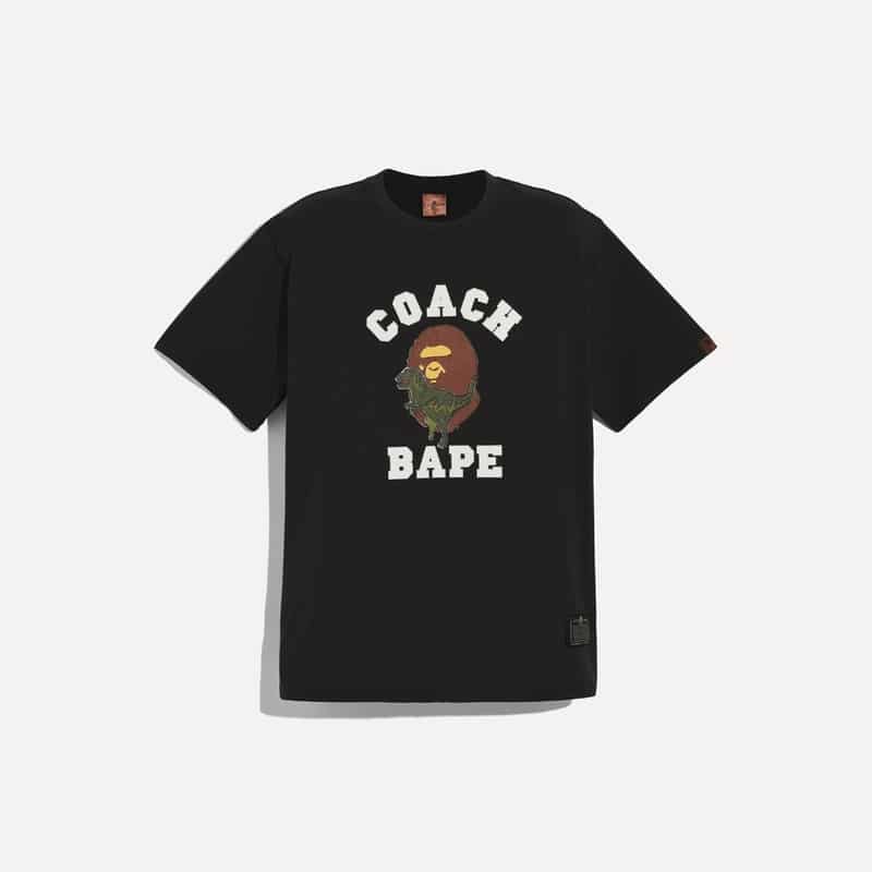 Be pleasantly surprised by the creative mix of characters, styles, and colours. On the classic Coach perpendicular C prints, the witty designers have replaced some Cs with the silhouette mugshot of the BAPE Ape. Instead of the traditional horse-and-carriage Coach logo, the BAPE Ape shares the centre stage with the dinosaur.