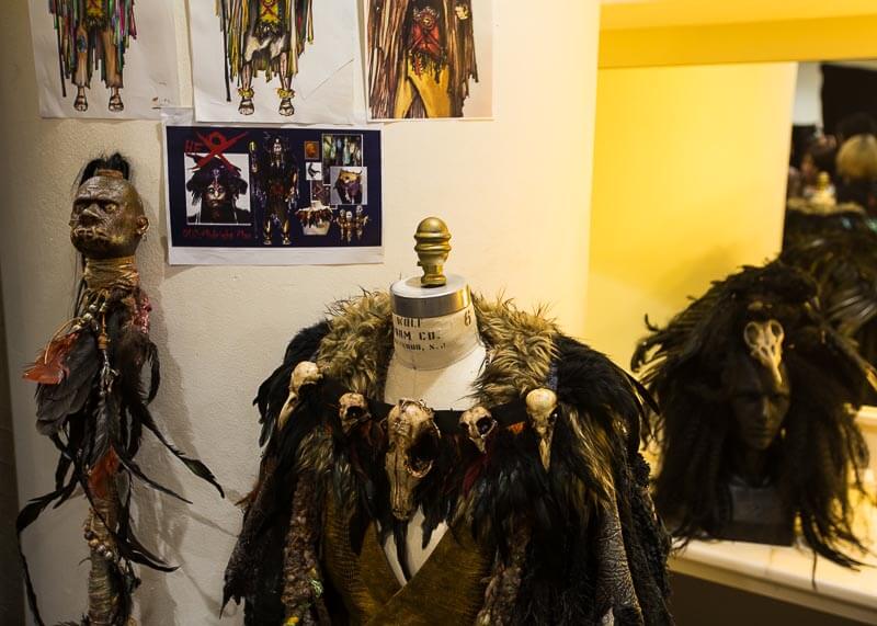Skulls as trinkets, feathered embellishments and cruddy garments decorate the whole ensemble of the Midnight Man.