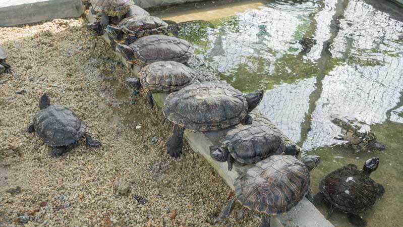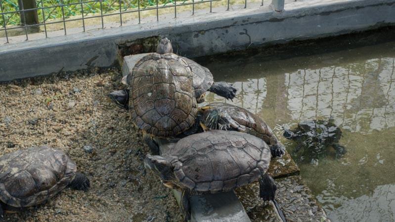 We suggest you head to the Animal Corner first as most of the action takes place there. Meet the great wall of terrapin, made up of sunbathing reptiles escaping the cold water.