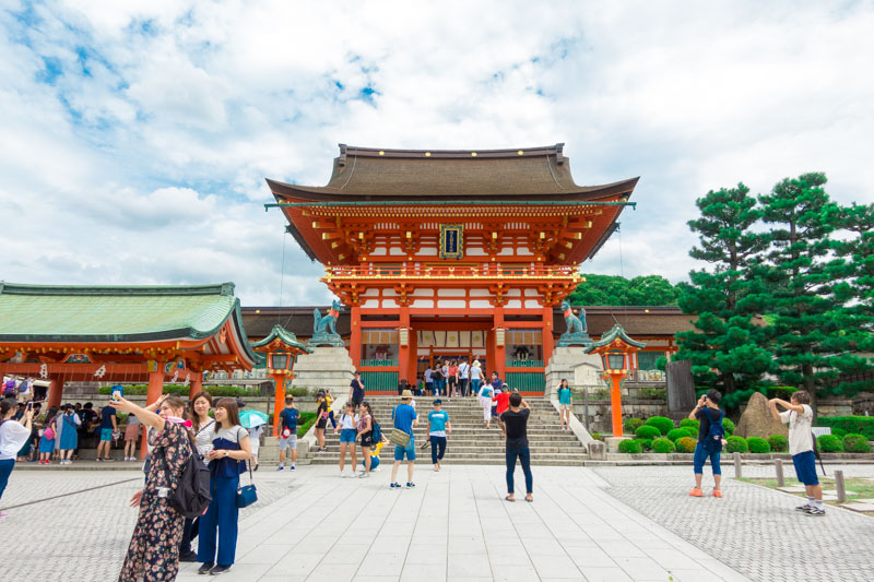 Before you hike up the seemingly excruciating 5km hiking trail, where the dense rows of vermillion torii gates (also known as the Senbon Torii) are located, pay respect at the Fushimi Inari-taisha (伏見稲荷大社).