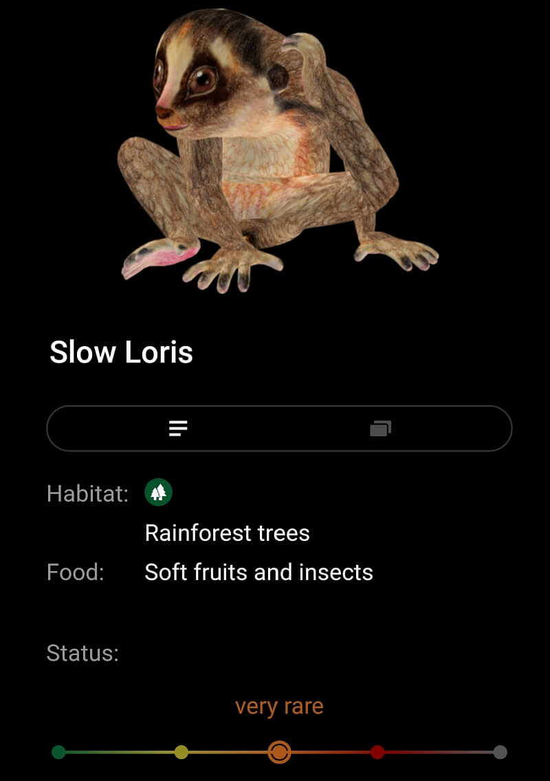 After snapping and saving a photo of an animal, it’s image should change from a shadow to a coloured icon under My Collections. Don’t worry, your snapshot does not have to be picture-perfect for this to work. Tapping on any icon on this page, even the grey silhouettes, will bring forth a bio sheet like the one below.
