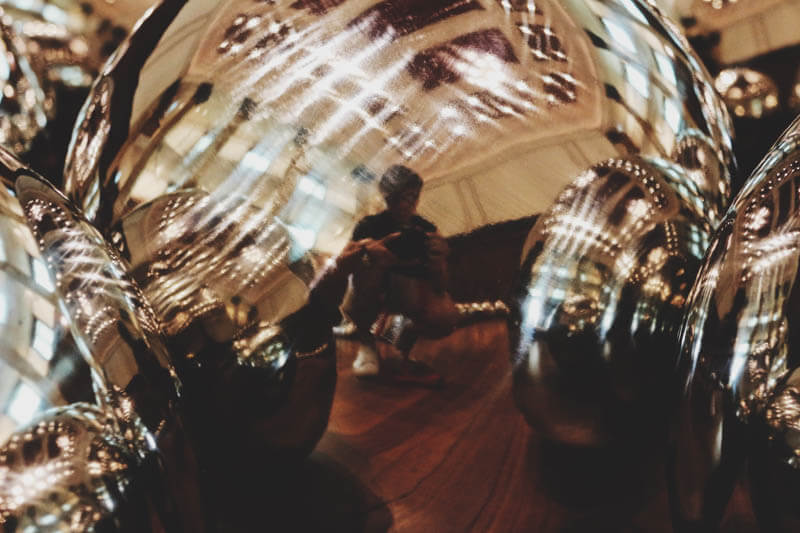 Heading out of Gallery C, proceed to Gallery H for a balling good time (literally). Featuring an array of tightly-arranged silver globes, this installation creates a vast shimmering field that reflects the images of every visitor walking through.